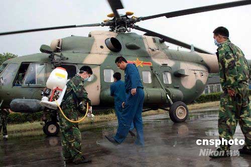 為防止疫情發生,中國空軍成都場站嚴密組織,堅決杜絕疫情傳播源頭,凡從災區回到機場的飛機、人員及物品,都要進行嚴格消毒。5月27日,該場站衛生防疫人員為剛從災區回來的飛行員及飛機進行消毒處理。中新社發 譚超 攝
