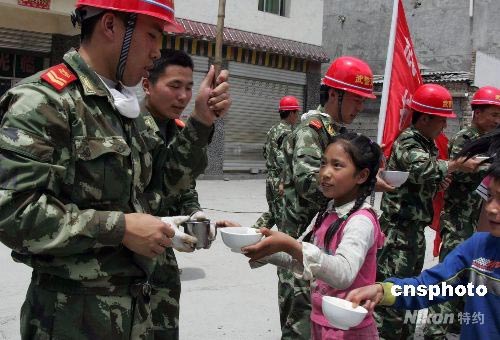 武警交通直屬工程部經過6天奮戰,5月27日終于打通了臥龍至“孤島”耿達的“生命線”,各種給養補給車輛開進被與世隔絕的重災區耿達鎮,當地民眾感謝武警官兵。中新社發 江胡 劉亞軍 攝