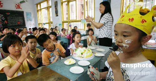 5月28日,重慶市永川區萱花小學三.三班全體同學為來自四川省江油災區的段明陽過了個簡單而隆重的生日,同學們分批次地把自己親手做的生日禮物送給段明陽,并祝她生日快樂。段明陽向全班同學清唱了一首《裝扮藍色的地球》表謝意,并一一把生日蛋糕喂給同學們,期望能盡早地融入到新的集體里。中新社發 陳仕川 攝