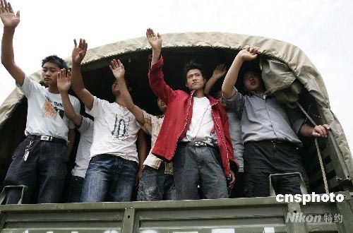 5月28日,四川平武縣南壩鎮19名受災青年集體前往沈陽打工謀生自救,在搭乘軍車離開時,揮手告別家鄉。平武縣在5. 12地震中損失慘重,25個鄉鎮18.6萬人全部受災90%以上房屋全部倒塌,截止27日16時,該縣3014人死亡,3555人失蹤。中新社發 杜洋 攝