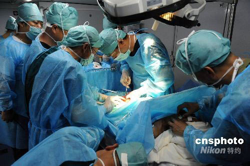 5月27日晚七點,四川都江堰市下起大雨造成市政停電。一名患者來到解放軍總醫院醫療隊就診,接診醫生初步診斷為急腹診,并立即在醫療隊野戰外科醫院野戰手術車內利用自給電進行手術。經開腹探查病人為結腸癌合并結腸穿孔,危及生命。經過20余名專家通力合作,手術獲得成功。中新社發 孔令占 攝