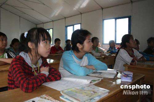 5月29日,文縣碧口小學學生在剛剛建成的抗震希望小學活動板房里上課,這是甘肅省重災區隴南在廢墟上建成的第一所災區希望小學。由共青團甘肅省委和甘肅省青少年基金會募集資金100多萬元建成的學校,共搭建活動板房教室22間1320平方米,可容納全校1200多名學生上課。中新社發 劉二銀 攝