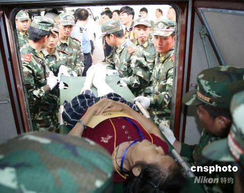 5月29日,徐州火車站,武警戰(zhàn)士小心地將傷員抬下火車。當(dāng)天,130名四川地震災(zāi)區(qū)傷病員乘坐“救28/7次”特殊專列順利抵達江蘇徐州。抵達后,他們迅速被安排到徐州市第一人民醫(yī)院、徐州醫(yī)學(xué)院附屬醫(yī)院等市區(qū)四家大醫(yī)院做進一步治療。中新社發(fā) 蔡廣銀 攝