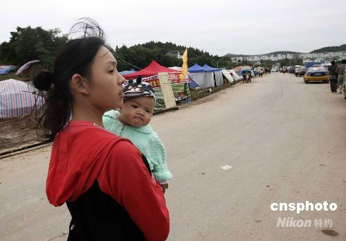 5月29日,受唐家山堰塞湖潰壩險(xiǎn)情影響,綿陽市游仙區(qū)沈家壩東街社區(qū)居民陸續(xù)撤離至富樂山高地,一位年輕的媽媽抱著孩子來到這里準(zhǔn)備開始避險(xiǎn)生活。中新社發(fā) 杜洋 攝