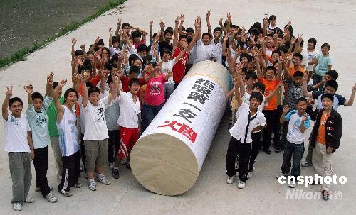5月31日,安徽淮北市桓譚中學的學生們制作了一支巨型“香煙”模型。全校700多名學生在這支寫有“拒吸第一支煙”的模型上簽名,立志遠離煙草。 2008年5月31日是世界衛生組織發起的第21個世界無煙日。本次無煙日的主題是“無煙青少年”,口號是“禁止煙草廣告和促銷,確保無煙青春好年華”。中新社發 李博 李春輝 攝