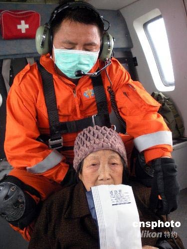 5月31日,90歲老奶奶被民航直升機南航珠海S76型7307號飛機成功救出。家住綿竹市清平天池南木溝的老人,地震前獨居深山。5.12汶川地震發生時,老人在室外乘涼,腰部被山石擊傷。因出山和進山路中斷與外界隔絕聯系,一直被困深山中。19天來靠吃野菜維持生命。民航直升機抗震救災基地接到綿竹搜救部隊的消息后,當即派出兩個機長劉洋、段俊德執行飛行任務,交通部南海第一飛行隊救生員李春林、絞車手宋樂平一同前往。由于地形復雜,山式狹隘,峽谷電線縱橫交錯,沒有可著地條件,搜救人員只好實施空中救援。上午10時40分成功將老人救出。中新社發 張鈺昱 攝