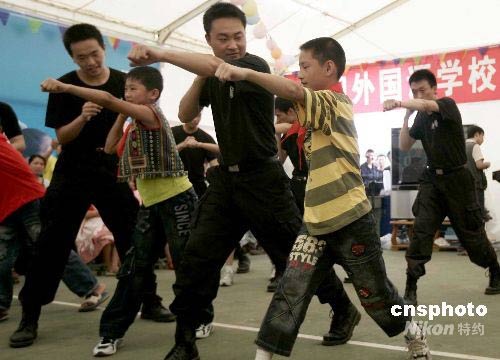 6月1日,在四川綿陽九州體育館受災民眾安置區,幾名男孩向特警學習軍體拳。中新社發 杜洋 攝