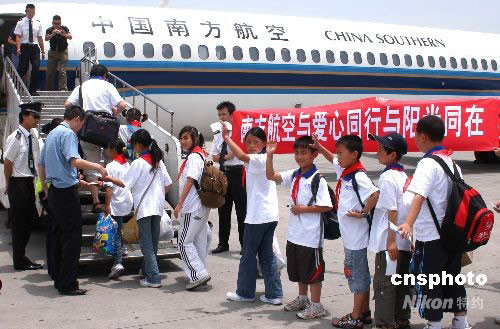 6月2日中午,成都雙流國際機場,89名來自北川、彭州、寶興、崇州等地震災(zāi)區(qū)失去親人的兒童,乘坐南方航空海南分公司的愛心專機前往海南三亞,進行為期半個月的“愛心呵護、陽光行動”心靈呵護之旅。他們中年齡最大的16歲,最小的8歲。中新社發(fā) 尹海明 攝