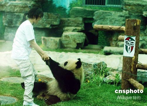 圖為在活動場里憨態可掬的大熊貓與飼養員“拔河”。6月5日上午,8只四川大熊貓首次與游客在北京動物園見面。他們憨態可掬十分惹人喜愛,頑皮的動作不時引得游客發出笑聲。這8只分別叫做翠翠、朵朵、美欣、鳳儀、淘淘、朗朗、歡歡、福娃的活波可愛的大熊貓分別住在面積為20多平方米的3間獸舍內,每間獸舍都安裝了空調,室內的溫度控制在大熊貓喜歡的25攝氏度左右,這使這些可愛的大熊貓感受到與四川臥龍家鄉一樣的環境。中新社發 筱瑋 攝