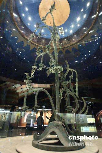 6月14日,游客在觀賞國寶青銅器太陽樹。四川汶川大地震并未對中國著名的三星堆古文化遺址造成損壞,依然供游客游玩。中新社發 賈國榮 攝