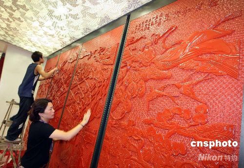 六月十六日,由北京漆寶齋錦麗漆藝工作室設計制作的奧運主會場“鳥巢”貴賓廳“盛世和諧圖”移動式屏風等漆藝作品設計制作基本完成,施工人員在做最后的調整與修飾。