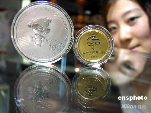 7月2日,市民在青島一家金幣公司觀看2008年殘奧會紀念幣。據了解,這套剛運抵島城的紀念幣由中國人民銀行發行,帶有流通面值。這套紀念幣有兩枚,三分之一盎司的金幣面額150元人民幣,一盎司重的銀幣面值10元,全國發行量分別為1.5萬枚和3萬枚。紀念幣上鑄有2008年殘奧會吉祥物“樂樂”和殘奧會徽標。中新社發 趙健鵬 攝