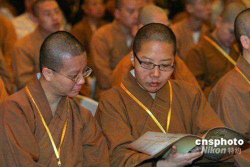 7月9日,“2008年佛教外語交流會”在上海玉佛寺舉行,海內外百余位佛教界代表濟濟一堂,以英、韓、日等多種語言暢談開展國際交流的經驗與心得。以佛光山為首的臺灣地區佛教界的二十余名外語人才代表,也應邀出席。圖為來自臺灣的覺楷法師(左)和有智法師(右)在交流會上。中新社發 湯彥俊 攝