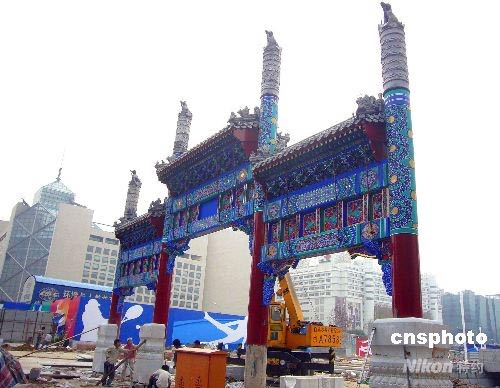 7月9日, 重新復建的明代西單牌樓在北京西單文化廣場初展“芳容”。歷時三個多月的北京西單文化廣場整治工程已接近尾聲,奧運會前夕將全新亮相。中新社發(fā) 玉龍 攝