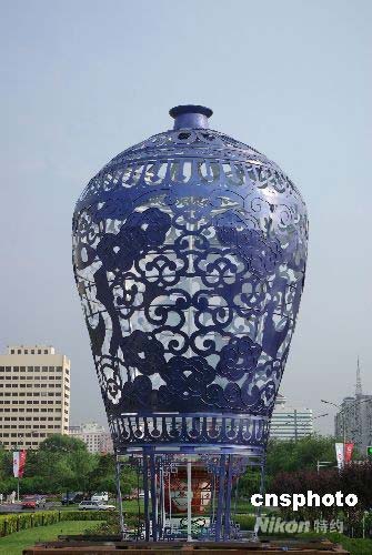 7月21日,一只裝飾清秀素雅的高大“青花瓷”矗立在北京長安街上,給即將到來的北京奧運會更添幾分中國色彩。中新社發 九州 攝