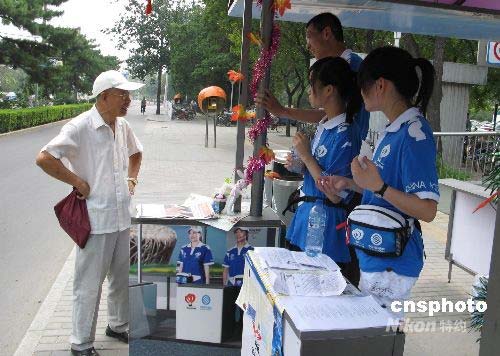 7月21日,以大學生為主體的奧運志愿者們,在100多個由中國移動通信援助的“北京奧運會志愿者服務站亭”中,為市民和中外游客解答奧運比賽場館及交通服務知識。中新社發 鄒憲 攝