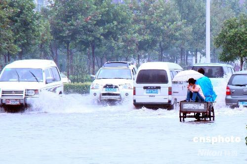 7月21日到23日,河南遭受本月第5次暴雨侵襲,降雨量約60毫米至100毫米,鄭州多處路段出現深度積水。圖為汽車在積水中艱難前行。中新社發 李冰 攝