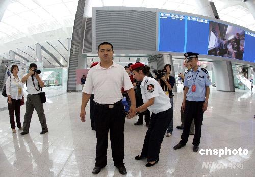 北京奧運會的重點配套工程——京津城際鐵路8月1日將正式運營。在始發站北京南站,車站反恐防爆設立“五道防線”,即車站廣場及周邊地區的巡查,強化車站出入通道管理,嚴格進站旅客攜帶物品的安檢,加強候車室、售票廳、行李房、行李寄存處的管理,加強列車安檢。圖為安檢人員進行通車前的最后安保演練。中新社發 杜燕 攝