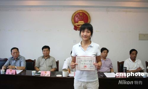2008年8月1日上午,心理咨詢師張帆向大家展示人民陪審員證書。當天,經鄭州市二七區人民法院院長靳風英提請,鄭州市二七區第十四屆人大常委會第九次會議通過,任命共青團鄭州市委12355青少年維權及心理咨詢中心主任袁林方及心理咨詢師張帆,為鄭州市二七區人民法院少年刑事審判庭人民陪審員,這也意味著該兩名心理咨詢師從此在刑事審判中擁有了人民陪審員的審判職能。中新社發 王中舉 攝