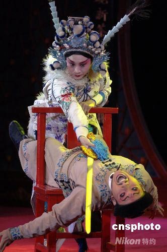 8月3日晚,北京老舍茶館推出一臺新編主題文化演出劇目《四季北京.茶》,以中國茶文化為主線,以特點鮮明的北京四季變化為舞臺背景,并借助多媒體影像等高科技手段,吸引眾多海內外游客觀看。圖為精彩的京劇表演。中新社發 王東明 攝