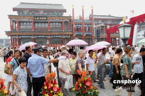 8月7日,眾多北京市民及外地游客在警察的疏導(dǎo)下,有次序地參觀改造后的北京前門大街。當(dāng)日,北京前門大街正式對外開放。經(jīng)過2年多的擴建、改造,老牌樓、有軌電車、老字號店鋪重現(xiàn)老北京時的風(fēng)貌。中新社發(fā) 史利 攝