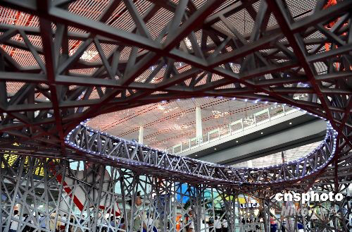 8月12日,北京首都機場T3航站樓搭建一處類似于“鳥巢”體育館的景觀,歡迎奧運賓朋。 中新社發 廖攀 攝