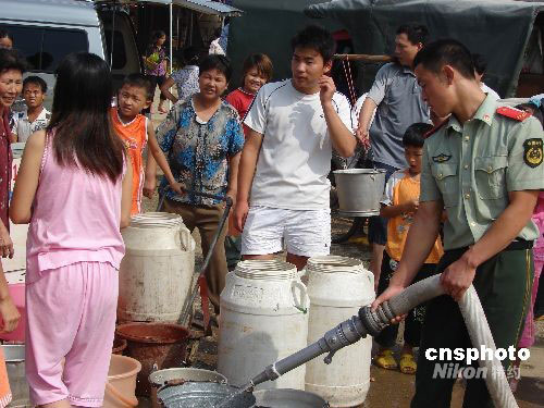 8月30日至9月1日,廣西柳州市柳城縣因水廠機器爆裂,造成縣城停水,4萬多人飽受缺水之苦。水廠方面稱目前仍在搶修,爭取盡快恢復供水。柳城消防官兵為當地民眾送水,以解燃眉之急。中新社發 莫洪立 攝