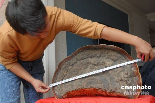 9月1日,黑龍江海林市民李先生家中,一株直徑61厘米、寬42厘米、重9.5斤的巨型野生靈芝。據李先生介紹經省醫藥專家鑒定,認為形體這么大的野生靈芝最少也得生長百年以上,而且品相這么好實屬罕見。中新社發 高福貴 攝