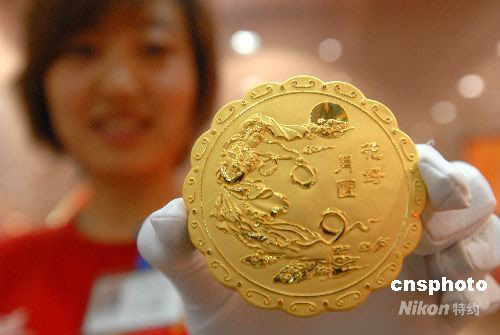 9月3日,遼寧省沈陽市一黃金商店內,服務人員展示迎接中秋佳節的黃金月餅。該月餅用24K黃金制作,售價在10000元左右。中新社發 孫海 攝