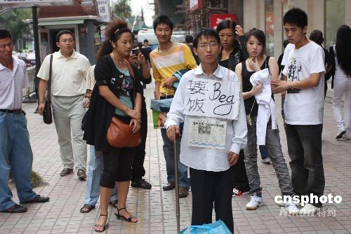 9月9日,一名特別的“乞丐”在哈爾濱市南崗區果戈里大街乞討。記者了解到,“乞丐”名叫夏海波,1982年9月15日出生,高二時因病輟學,治病花光了家里的錢,但是病還是沒有醫治好。2006年他離開家鄉,試圖找份工作養活自己,但因為自身殘疾沒有找到合適的工作。生活使他走上街頭,試圖靠乞討的錢治病延緩病情發展。夏海波開了博客,將每天的感受記錄在博客里。他在博客里公開了自己的銀行帳號,以便接受網友的捐助。中新社發 王忠言 攝