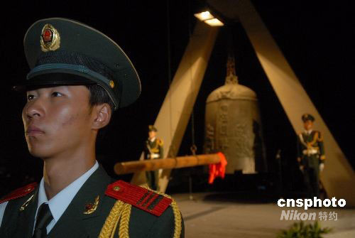 2008年9月18日晚九點(diǎn)十八分,遼寧沈陽市在九一八事變事發(fā)地舉行隆重的撞鐘儀式。警鐘長(zhǎng)鳴,勿忘國(guó)恥。中新社發(fā) 孫海 攝