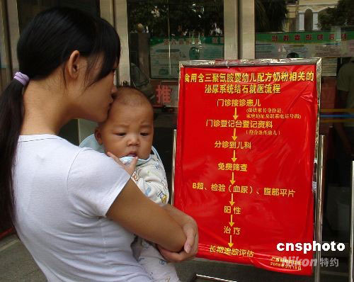 9月19日,廣西婦幼保健院門診樓前,一位母親準備帶小孩篩查腎結石。問題奶粉事件在中國各地引起家長們的普遍擔憂,廣西諸多醫院紛紛開設“綠色通道”等便民措施。中新社發 王剛 攝