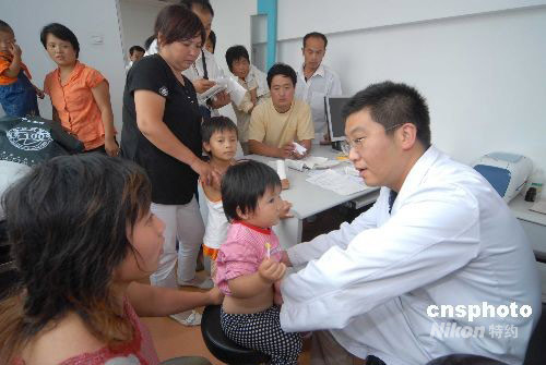 圖為食用過“問題奶粉”的小孩在山東濰坊市人民醫(yī)院查體。自含有三聚氰胺“問題奶粉”曝光后,濰坊市人民醫(yī)院成立了“問題奶粉”患兒就診專家小組,開通了“問題奶粉”患兒就診綠色通道,為前來檢查的兒童進(jìn)行及時(shí)篩查診斷。中新社發(fā) 王曉光 攝