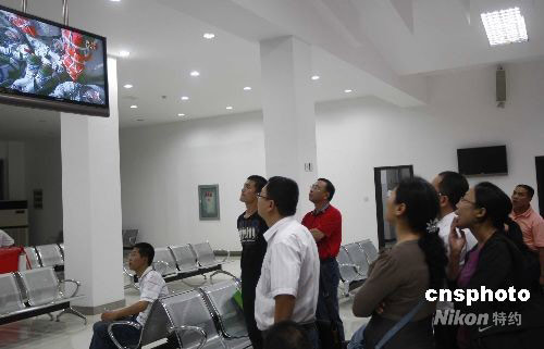9月25日晚,“神七”升空引起國人關注,圖為在江蘇南通興東機場候機的乘客觀看“神七”升空的電視直播。中新社發 盛佳鵬 攝