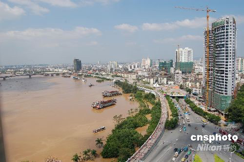 9月29日,邕江(珠江上游)8年以來最大洪峰通過廣西南寧,沿江兩岸大堤下許多樹木和路燈被淹沒。今年第14號臺風“黑格比”盡管已經遠離消失,但給廣西帶動來的影響最近幾天仍在繼續,江河水位不斷上漲。南寧市邕江水位當天下午2點前后達到75.83米,超警戒水位2.86米,為2001年以來的最大洪峰。中新社發 劉萬強 攝