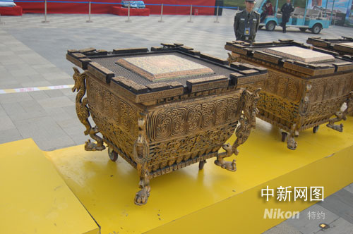 奧運開幕式道具—缶在北京朝陽國際旅游文化節上亮相,吸引游客駐足觀賞。張濛 攝