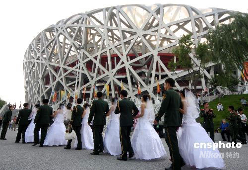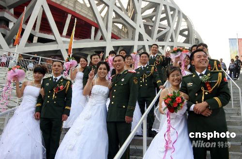 9月30,喜結(jié)良緣的奧運安保武警與新娘在國家體育場“鳥巢”前集體留影。當天,武警十三支隊21位奧運安保武警在數(shù)次推遲婚期后,終于步入婚姻殿堂。據(jù)了解,這21位武警戰(zhàn)士從今年初開始就沒有休過一天假,原定的婚期一拖再拖,直到奧運結(jié)束后,才定為國慶節(jié)期間完婚。中新社發(fā) 吳芒子 攝
