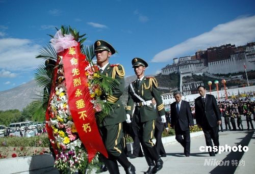 10月1日上午,在布達(dá)拉宮廣場上舉行升國旗儀式后,在紀(jì)念碑前向革命先烈敬獻(xiàn)了花籃,緬懷為西藏革命和建設(shè)事業(yè)作出重大貢獻(xiàn)的革命前輩們。圖為武警戰(zhàn)士抬著花籃走向布達(dá)拉宮廣場上的紀(jì)念碑。中新社發(fā) 周波 攝
