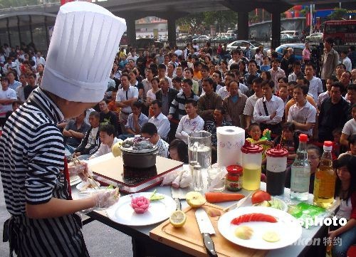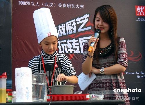 2008年10月1日,武漢市漢口航空路一廚藝大賽現(xiàn)場(chǎng),11歲女童余秋萍上臺(tái)和成年人一起比賽烹調(diào)技藝。據(jù)了解,小學(xué)生余秋萍從9歲就開始學(xué)習(xí)廚藝,經(jīng)常在家炒菜做飯,認(rèn)為自己的手藝不錯(cuò),就報(bào)名參加了這次比賽。中新社發(fā) 孫新明 攝