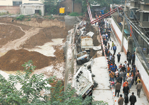 10月8日11時45分左右,位于西安市新城區長纓東路的北張家莊村里,一處長約70米的道路突然發生大面積塌陷,坍塌面積大約有300平方米,造成停放在公路上的9輛貨運汽車瞬間掉入了深約3米的坑中。路面塌陷過程中,附近群眾都以為是地震了,遂四散逃離。該起事故沒有造成人員傷亡,塌陷原因目前正在調查當中。