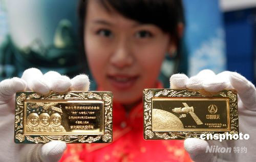 10月9日,為紀(jì)念神舟七號(hào)成功發(fā)射和中國首次太空行走圓滿成功,作為國家紀(jì)念 “神七”飛天活動(dòng)的重要組成部分,中國航天部門首次面向全球發(fā)行“金鑲鉆神七金條”。“金鑲鉆神七金條”分45克、90克、300克和1000克四種規(guī)格,全部采用999純黃金制作,正面的主體圖案為三位宇航員肖像,背面為神七飛船和宇航員出艙行走的風(fēng)姿,這在中國航天史上尚屬首次。中新社發(fā) 趙雋 攝
