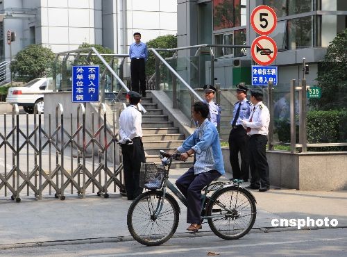 圖為上海高院門口安檢森嚴,吸引騎車路人張望。
