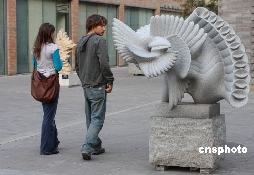 10月14日,不少游客在今日美術館欣賞數碼石雕。近日,以“科技與藝術的完美交融”為主題的數碼石雕全國巡展在北京今日美術館拉開帷幕。這些作品首先由美國藝術家使用三維數字設計解決方案,在電腦虛擬的環境中進行設計、分析、模擬和建模。而后,中國的雕刻師們參照三維快速成形打印設備制作的物理模型,以手工雕刻完成。中新社發 吳芒子 攝