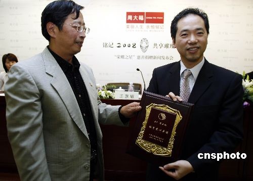 10月15日,著名珠寶品牌周大福在國家體育總局,舉行名為“銘記2008,共享璀璨榮耀”的慈善捐贈新聞發布會,宣布將周大福Forevermark永恒印記“榮耀之星”的部分拍賣款項50萬元人民幣,捐助予“中華全國體育基金會(中國運動員委員會)”,這也是該委員會成立以來的首筆社會愛心團體的公益捐贈,此筆善款將用于支持該委員會開展體育公益工作,以號召更多企業關注和支持中國體育事業發展。周大福董事陳世昌先生、國家體育總局體育基金管理中心副主任、中華全國體育基金會副理事長王彥敏先生與著名運動員周繼紅女士(國家體育總局游泳運動管理中心副主任、運動員委員會主任委員),錢紅女士(游壇“五朵金花”之一),高紅(“鏗鏘玫瑰”之一、老國家女足守門員)均蒞臨現場。此前拍賣的Forevermark永恒印記“榮耀之星”27.16克拉梨形美鉆,作為周大福專為2008年北京奧運會獻禮之作,脫胎于重達70克拉的南非原產鉆胚。更為珍貴之處在于在其臺面上印記有源自周大福鉆石原胚全球合作伙伴——世界最大的鉆石原胚供應商戴比爾斯集團的“Forever mark”永恒印記”,其中特別珍選并全球唯一的“20080808”序列號碼,特別銘記2008北京奧運,銘記中華體育世紀盛事。中新社發 楊可佳 攝