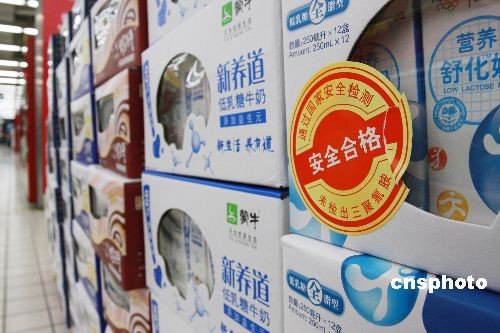 10月16日,北京一度下架的個(gè)別品牌液態(tài)奶,經(jīng)權(quán)威機(jī)構(gòu)檢驗(yàn)合格后,貼上安全合格標(biāo)識(shí)重新上架銷(xiāo)售。目前“下架奶”生產(chǎn)廠家已經(jīng)將重新檢驗(yàn)且合格的批次報(bào)告?zhèn)鬟_(dá)到超市,被檢產(chǎn)品則“仍在廠內(nèi)加緊貼上象征合格的綠色統(tǒng)一標(biāo)識(shí)”,預(yù)計(jì)蒙牛、伊利等品牌液態(tài)奶最遲會(huì)于17日重新回到零售終端。中新社發(fā) 鄭雄增 攝