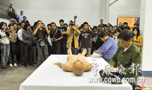 黃淋告訴記者,他表演的目的是將一個(gè)日;膱(chǎng)景變得陌生,讓觀者產(chǎn)生各種各樣的情緒和思考。兩位老太太則不管那么多,她們來只是為了各自50元的報(bào)酬。兩人都在黃桷坪大街上擺攤擦皮鞋,身邊的人也常常到美院當(dāng)模特,對(duì)裸露這種事也覺得平常。“擦他的身體,就像給我孫兒洗澡!逼渲幸晃焕咸f。 (記者 李藜/文 冉文/攝)