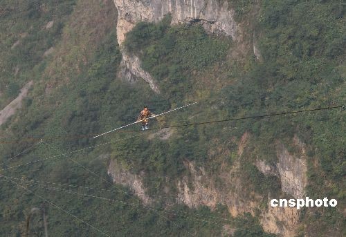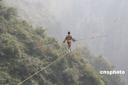 18日,“高空王子”阿迪力的親侄子賽買提·艾江在張家界天門山的萬仞絕壁之間展示了“達瓦孜”的驚人絕技。雖然賽買提在最后50米處意外“失手”,被救援人員接回終點,但在傾斜達39度的鋼繩上行走了650米,已經成功挑戰了世界最大斜度的高空走鋼絲極限。“達瓦孜”意思是“高空走繩索”,是新疆維吾爾族歷史悠久的民間傳統絕技。中新社發 鄧霞 攝