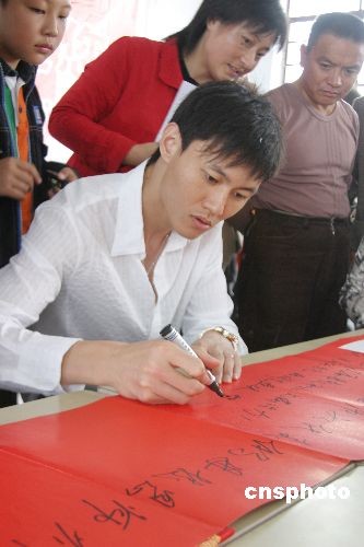 2008年10月19日,北京奧運(yùn)佩劍冠軍仲滿回到家鄉(xiāng)母校江蘇海安縣大公鎮(zhèn)北凌小學(xué)和北凌初中,回顧自己獲得冠軍的歷程,并為師生簽名、合影,感謝母校對(duì)他的培育。中新社發(fā) 江蘇-徐瑞平 攝
