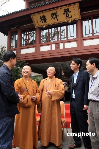 10月22日,高校佛學專家們與上海玉佛寺方丈覺醒法師(左二)、真如寺妙靈長老(中)參加“佛教與生態文明”學術研討會。當日,“佛教與生態文明”學術研討會在上海佛門圣地玉佛寺召開,中國高等院校著名學者、佛教界法師、居士數百人參會。中新社發 潘索菲 攝