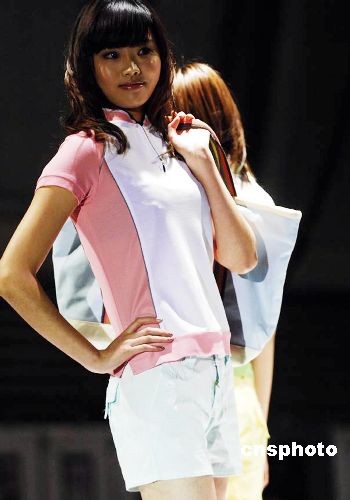 10月22日晚,2009春夏中國T恤流行趨勢發布暨“天然杯”第六屆國際T恤設計大賽作品展在上海舉行,該大賽吸引來自韓國漢陽大學、ESMOD國際服裝學院、萊弗士服裝學院等近百所高校的近3000幅作品。圖為模特展示院校T恤設計優秀作品。中新社發 錢興強 攝